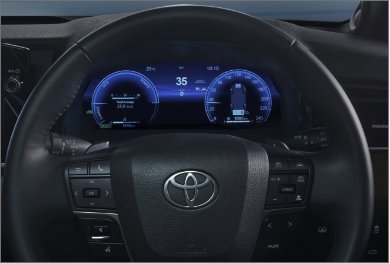 The Toyota Camry features a 2.5L Dynamic Force Engine with 5th Gen Hybrid Technology and a high-capacity lithium-ion battery. It delivers 221 Nm of torque at 3200 rpm, 25.49 km/l* fuel efficiency, and smooth acceleration with an advanced e-CVT Transmission across Sport, Eco, and Normal modes.